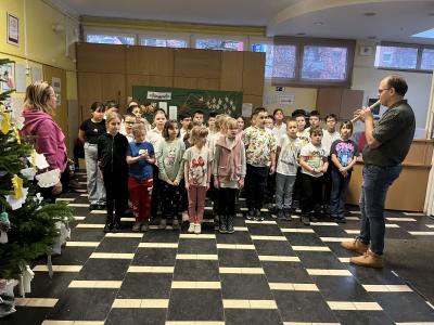 Pár nappal később már a csepeli Farkas Bertalan Általános Iskola tanulóihoz érkeztünk az ajándékokkal. A gyerekek már izgatottan felsorakozva vártak bennünket. Majd elkezdődött a műsor: iskola csengőhangú kórusa énekelt nekünk a tanár úr hangszeres kíséretével karácsonyi dalokat amit versmondások követtek. A műsor lezárásaként minden kisdiák a kezébe kaphatta jól megérdemelt cipősdobozát.